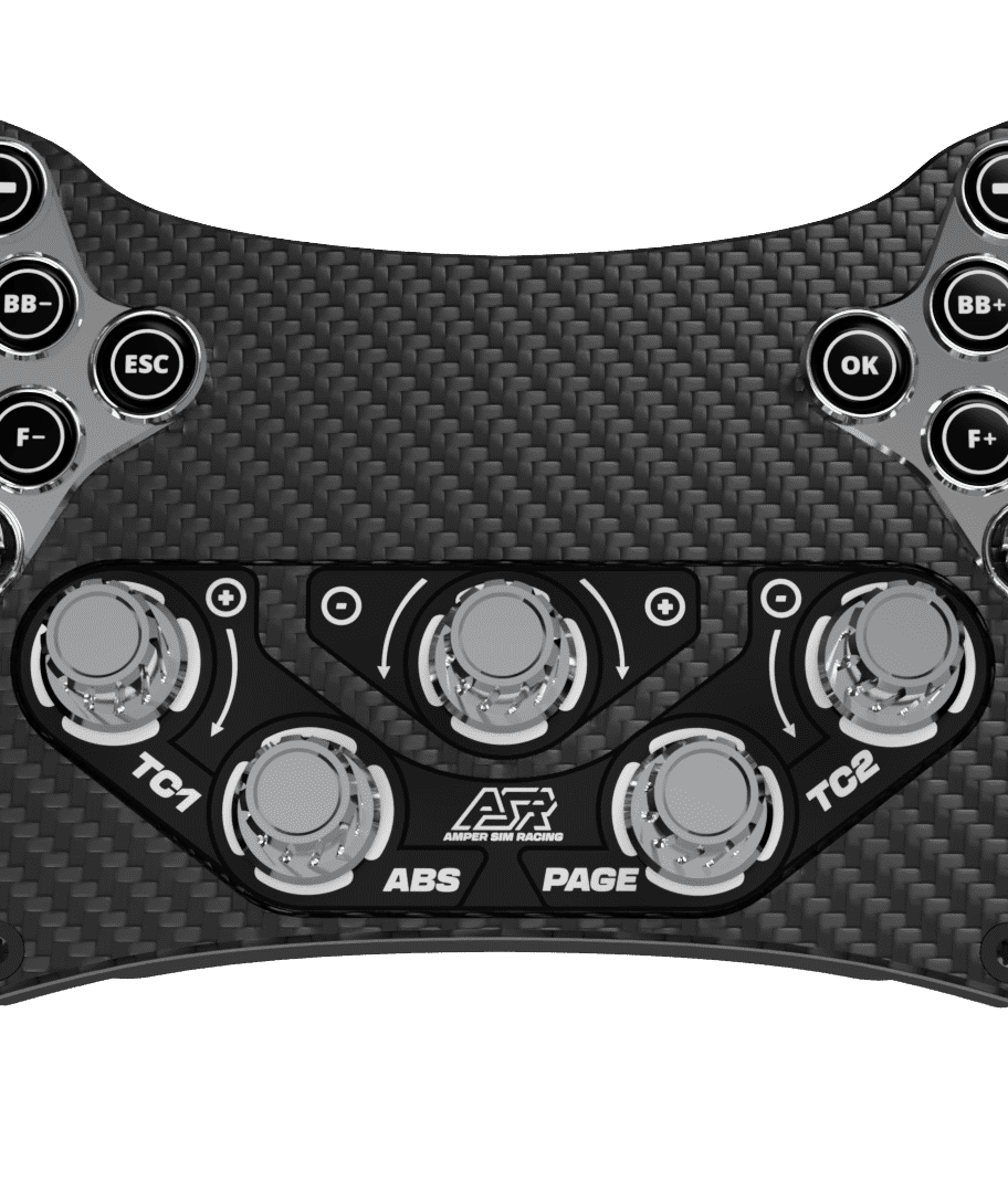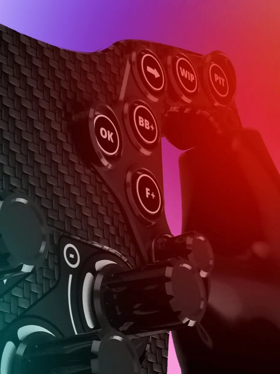 Der Lenkradcontroller bietet 45 frei belegbare Eingaben, darunter 12 momentane RGB-Drucktaster, 5 Drehencoder mit Druckfunktion, 2 siebenteilige Funky-Switches sowie jeweils 2 Kupplungs- und Schaltpedale aus eigener Entwicklung.